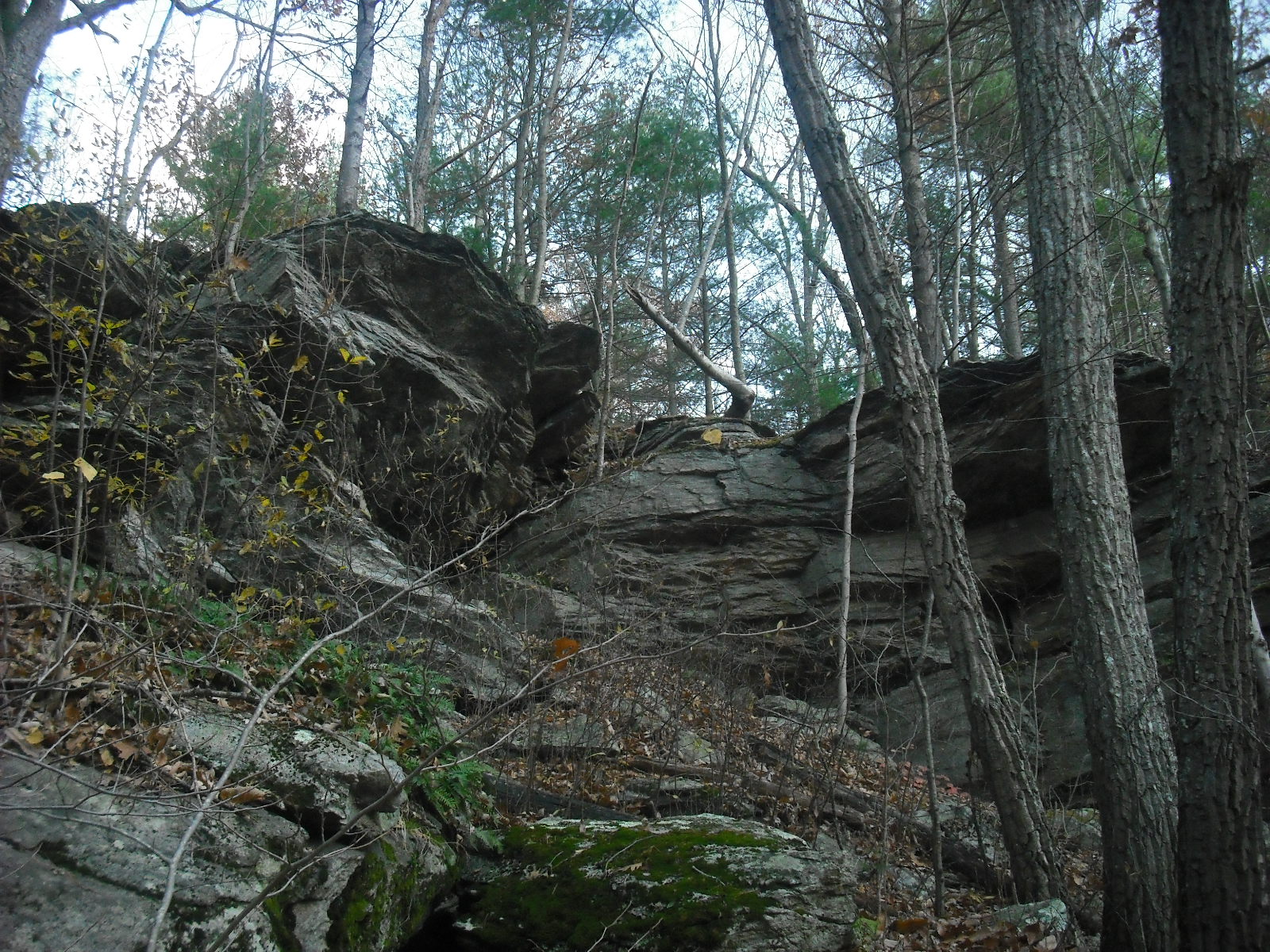 This is the same stack in "The Bent Tree" (11/3/11), and this is the view of the bent tree from the base of the cliff. The presence of the cairn and rock stack suggest that this quarry was once used by Native Americans.