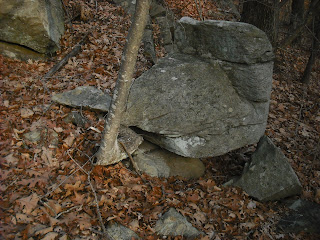 On the side of the steep hill overlooking the swamp, a rocky slope faces southwest. Near the bottom stands this propped boulder. The boulder and base have different textures and colors, indicating they weren't broken from one large boulder.